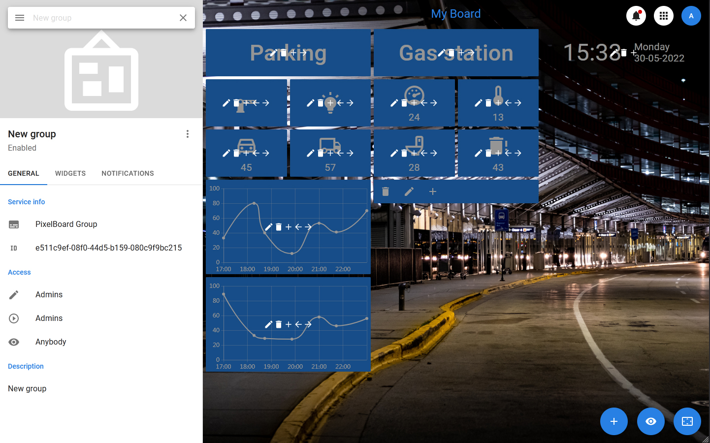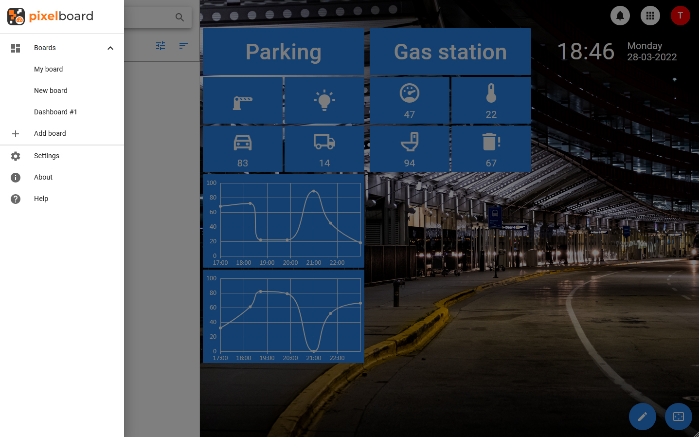 The PixelBoard interface is designed for viewing and editing dashboards. It can work in two modes: